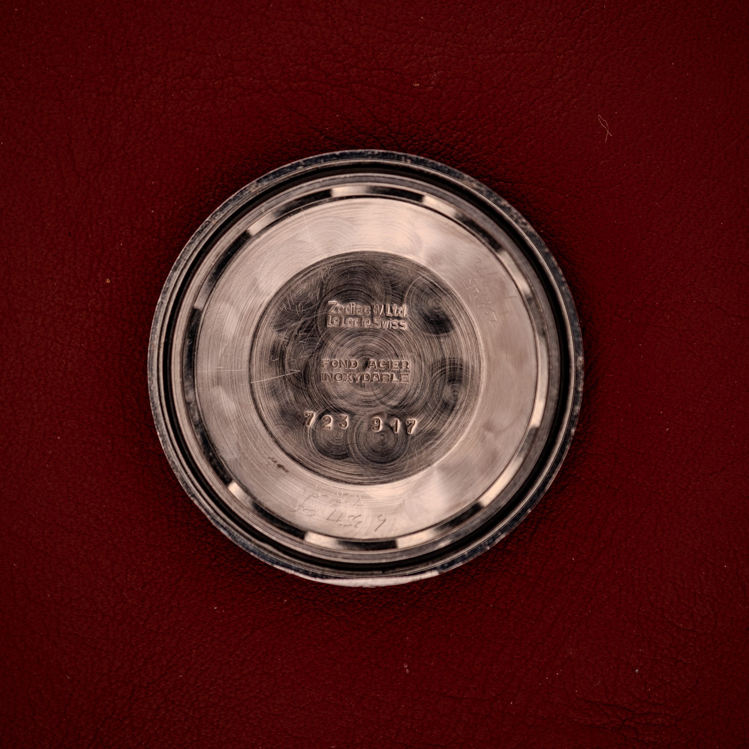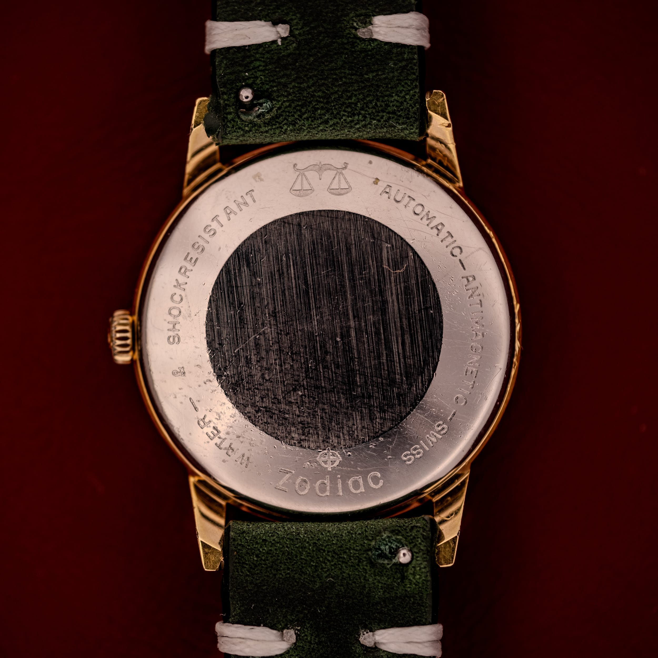 The gold-capped case is in remarkable condition, retaining sharp, defined lugs and a clean bezel with only the lightest signs of wear. The profile is slim and elegant, exactly the kind of proportions that make 1960s dress watches so comfortable and versatile on the wrist. The stainless steel caseback is properly signed with Zodiac’s iconic Libra scales motif, along with “Automatic,” “Antimagnetic,” “Swiss,” “Water Resistant,” and “Shockresistant” markings. The inner caseback confirms the Le Locle manufacture, stamped “Zodiac W Ltd, Le Locle, Swiss” and “Fond Acier Inoxydable” with the reference number 723 917.