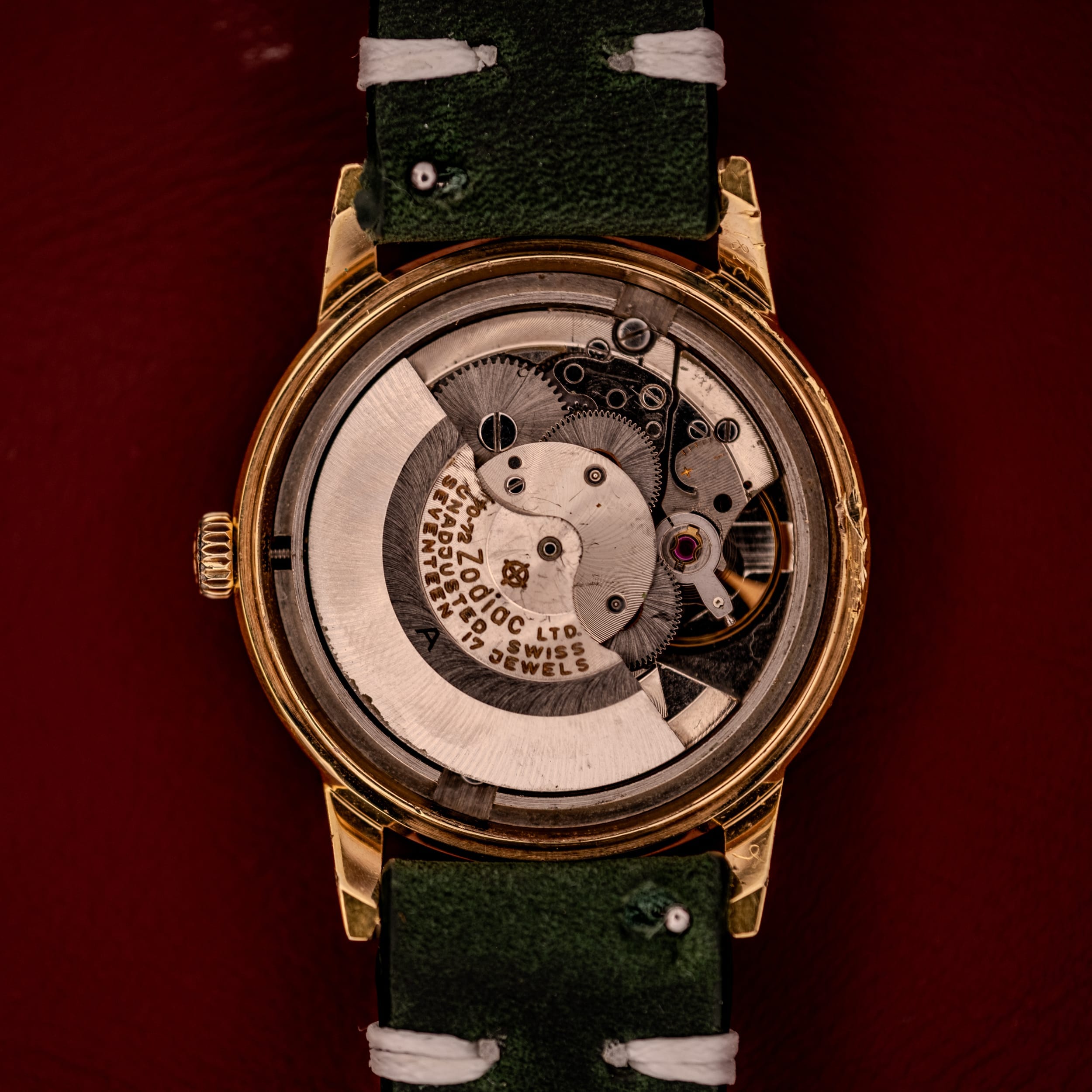 The Caliber 70-72 powering this watch is a movement that deserves particular attention. Based on the robust AS (Adolf Schild) ébauche family, Zodiac modified and signed these movements in-house, and the result was a workhorse automatic that proved itself across the brand’s entire lineup, from refined dress pieces like this Hermetic all the way to the demanding depths of the Sea Wolf. It is a 17-jewel, full-rotor automatic with Incabloc shock protection, a date complication quickset via the 21-to-24-hour window, and approximately 40 hours of power reserve. The Zodiac-signed rotor is visible with the caseback removed, engraved with the brand’s crosshair logo alongside “Zodiac Ltd, Swiss, Seventeen 17 Jewels.” It is a beautifully finished movement that speaks to the level of care Zodiac invested in even their more accessible references.