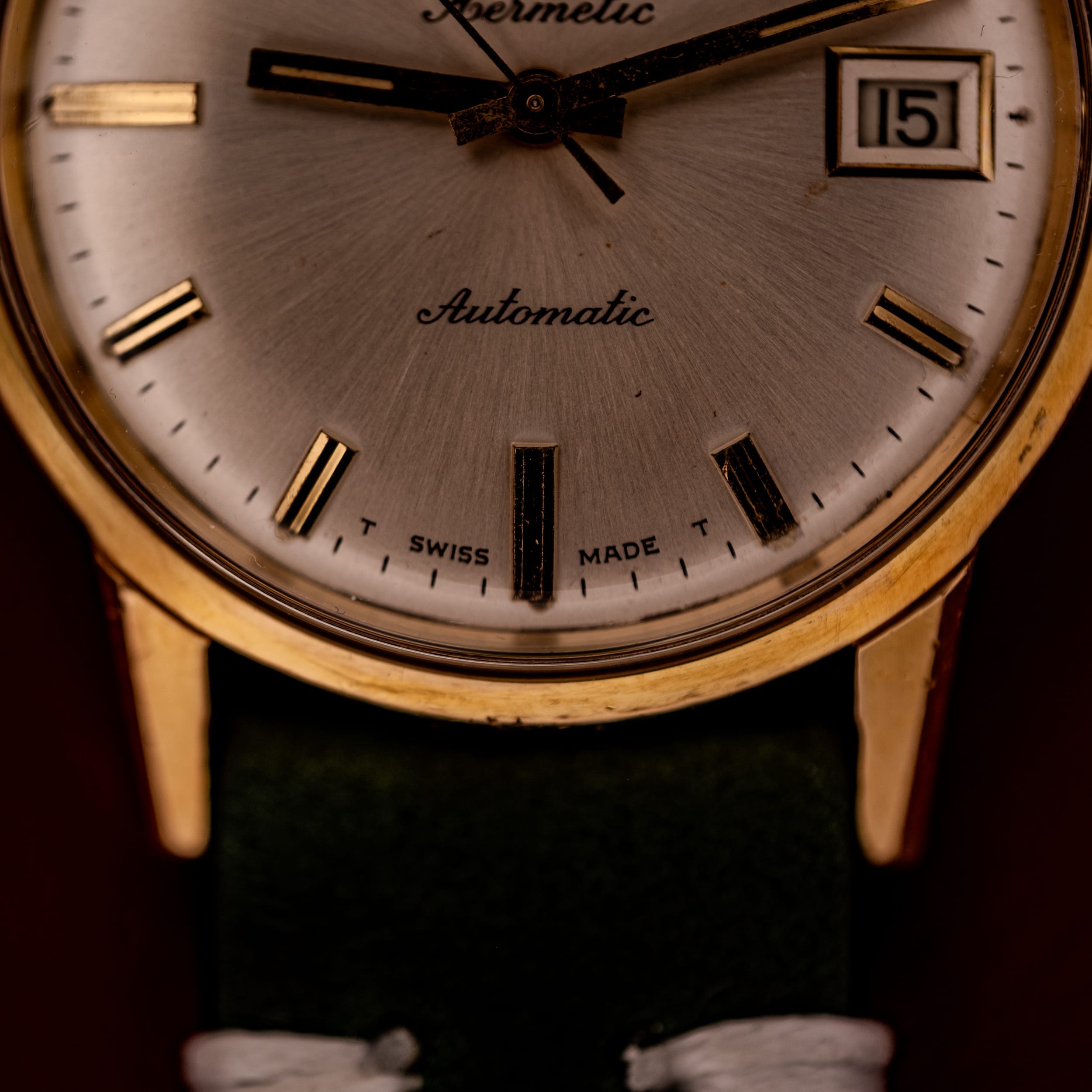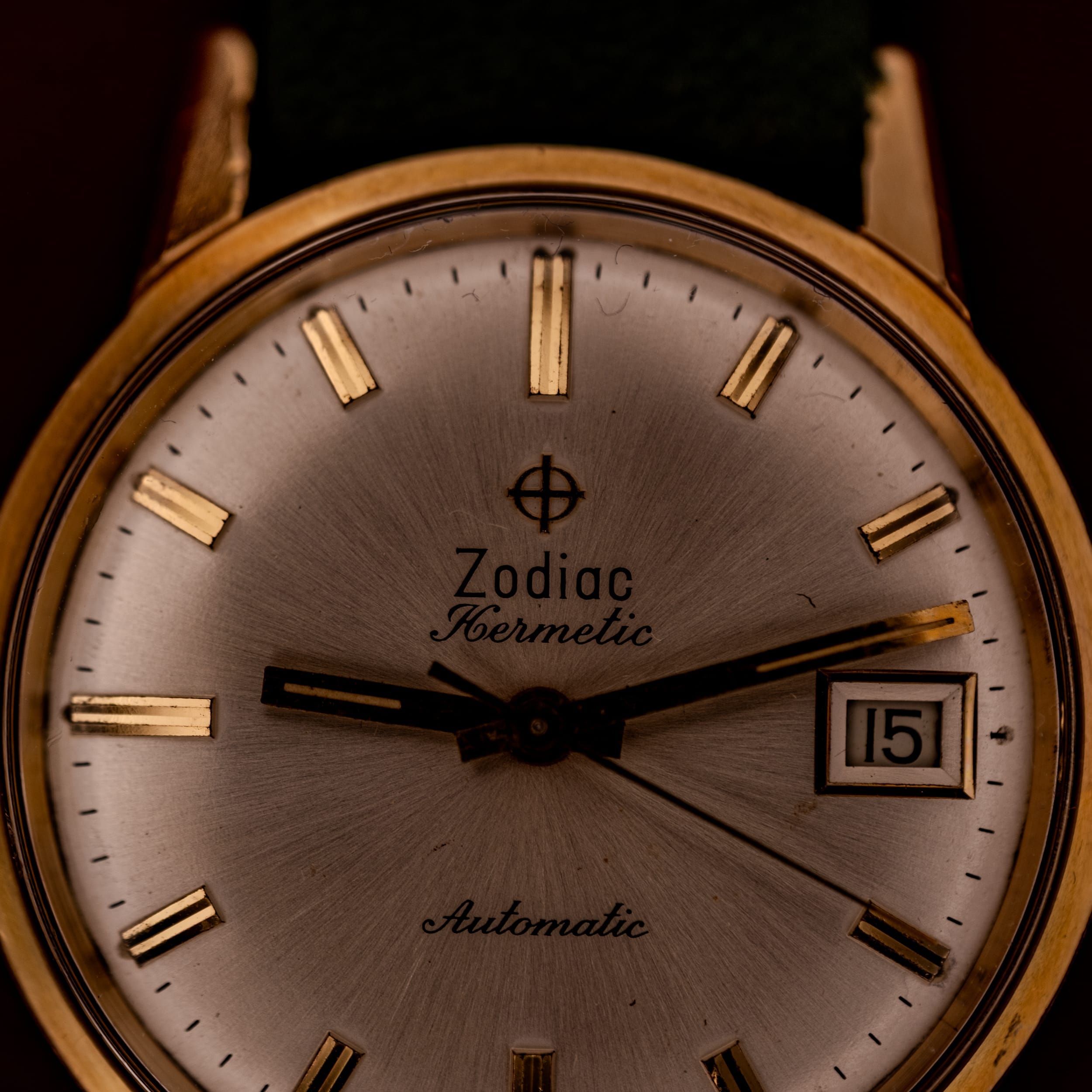 This particular example is a stunning representative of the line. The silver sunburst dial is in fantastic condition, with the radial brushing catching light beautifully and creating that shifting, alive quality that makes sunburst dials so endlessly satisfying on the wrist. The applied gold baton indices are all present and intact, each one faceted and catching the light with precision. The Zodiac crosshair logo, the “Zodiac” script, the elegant italic “Hermetic,” and the cursive “Automatic” designation are all crisp and fully legible. The framed date window at three o’clock is clean, with sharp printing on the date disc. The “T SWISS MADE T” designation at six confirms tritium luminous material on the original gold dauphine handset, which shows honest, gentle patina consistent with age.