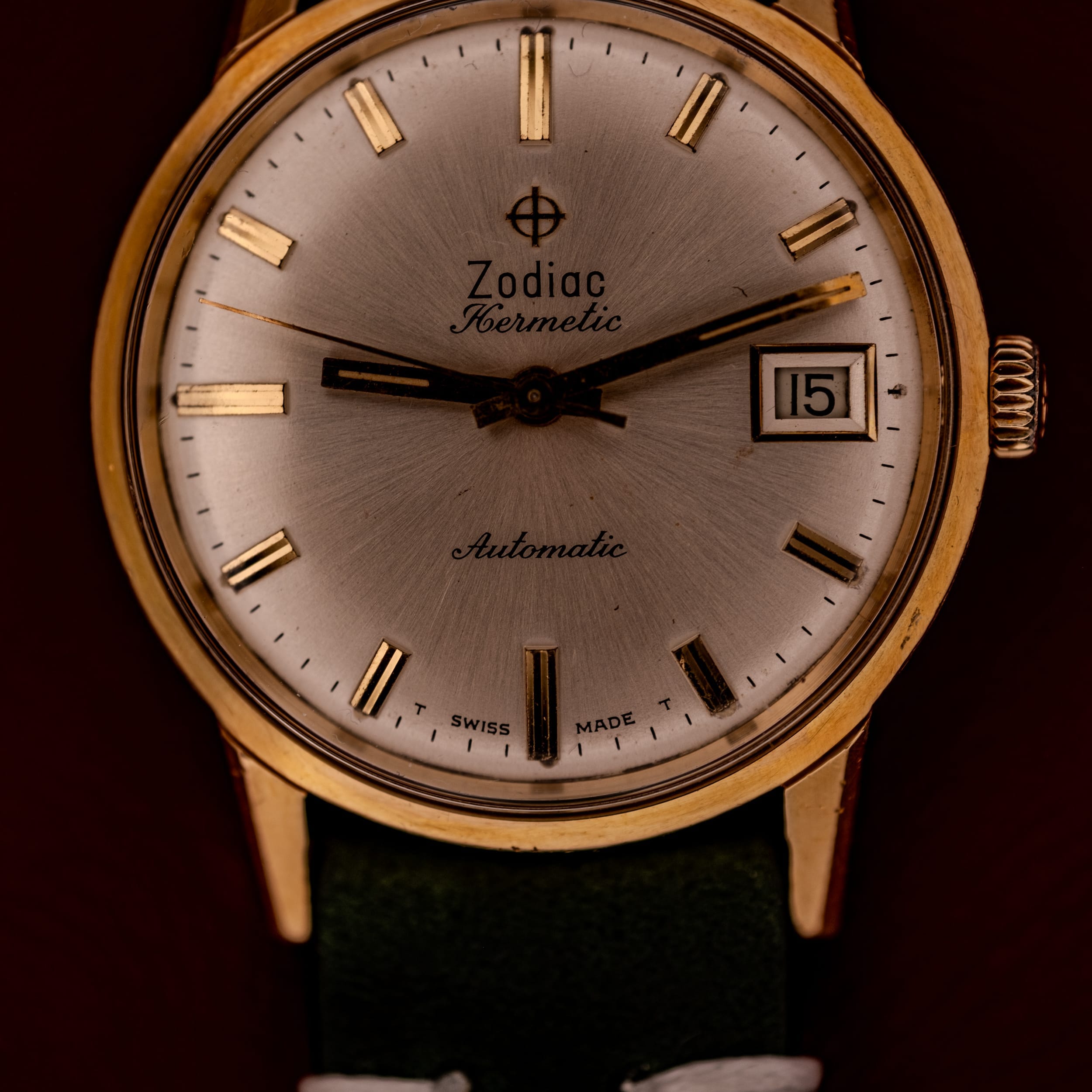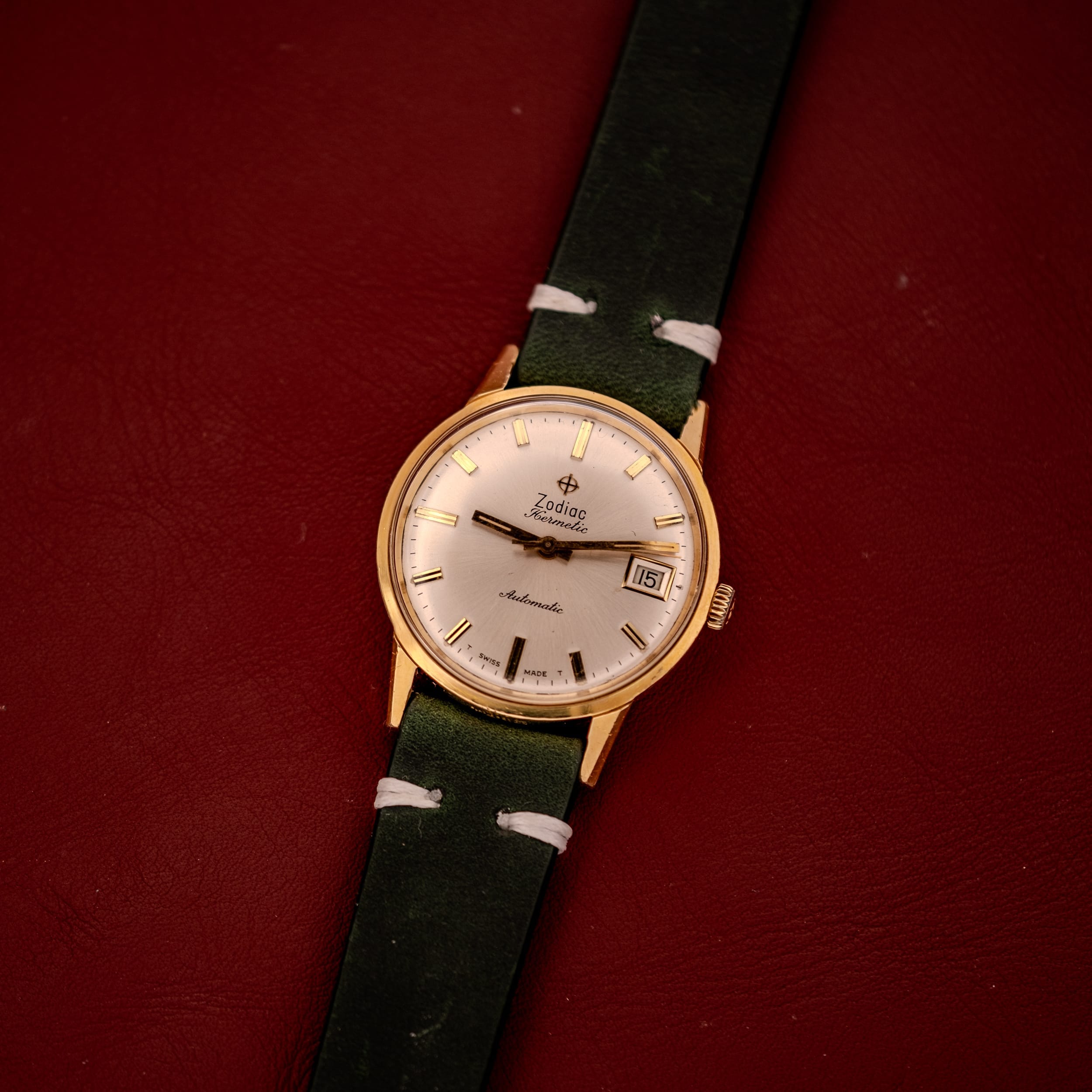 A gorgeous 1960s Zodiac Hermetic in a gold-capped case, featuring a stunning silver sunburst dial with crisp applied gold baton indices, a framed date aperture at three o’clock, and a matching gold dauphine handset. The case is remarkably sharp, and the overall presentation on a rich green leather strap is pure mid-century refinement.