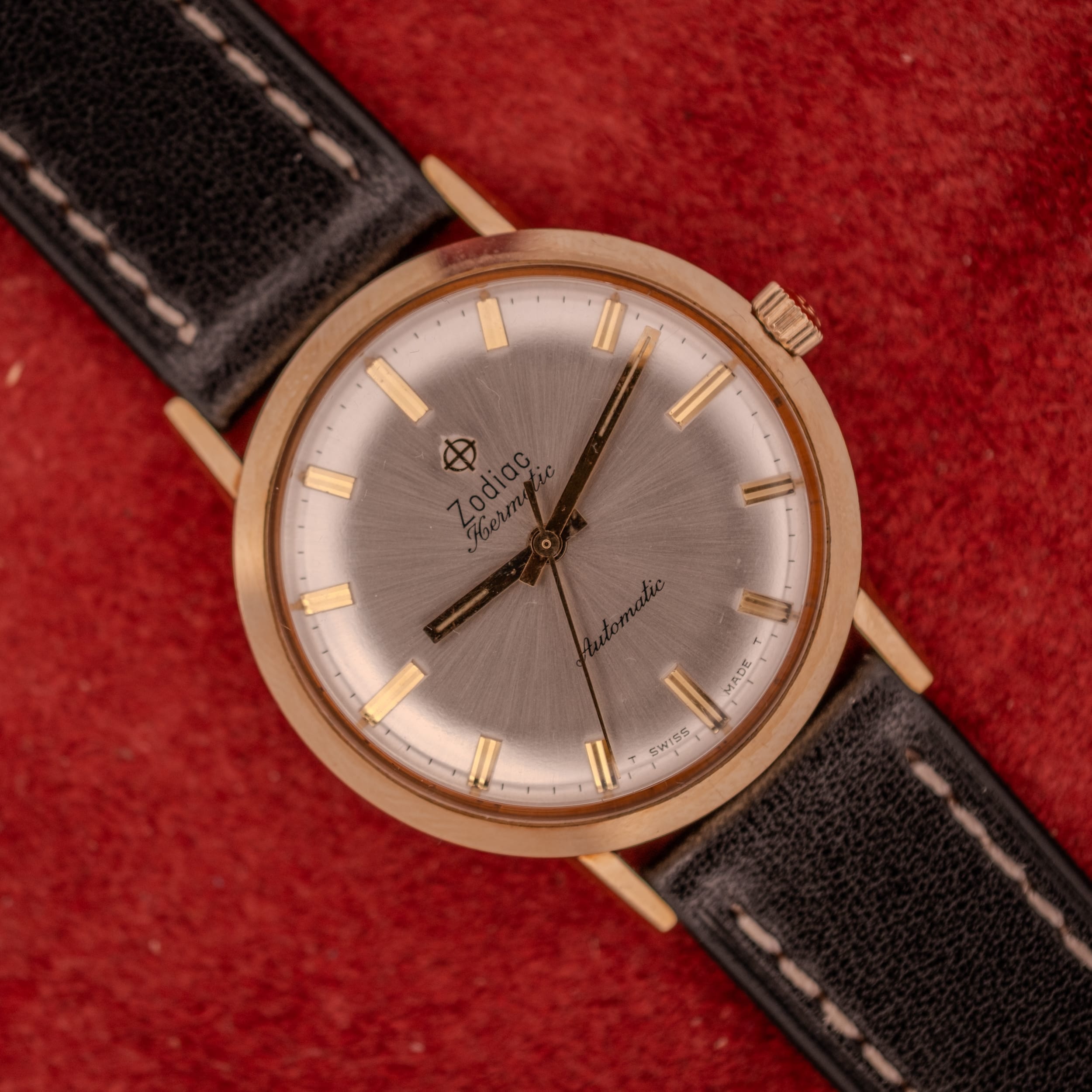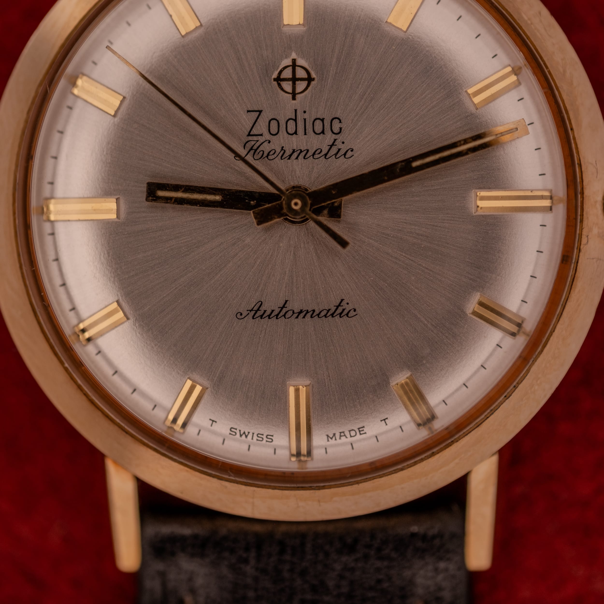 This particular example is, to put it plainly, a near time capsule. The dial is stunning. The radial sunburst finish is remarkably well-preserved, throwing light across its surface with a silvery brilliance that photographs can only hint at. In person, this dial shifts from bright white to warm silver to a cool steel grey depending on the angle, and the effect is mesmerizing. The applied gold baton markers sit cleanly against this luminous backdrop, their rectangular forms adding just enough visual weight to anchor the design without competing with the sunburst finish. The Zodiac crosshair logo at twelve o’clock is crisp and sharp, and the “Hermetic” script below it is rendered in a charming, slightly ornate typeface that gives the dial its personality. The “Automatic” script at six provides balance, and the “T SWISS MADE T” designation at the very bottom confirms the tritium luminous material in the hands. Speaking of which, the gold dauphine hands are in excellent condition, retaining their polished finish with minimal signs of wear.