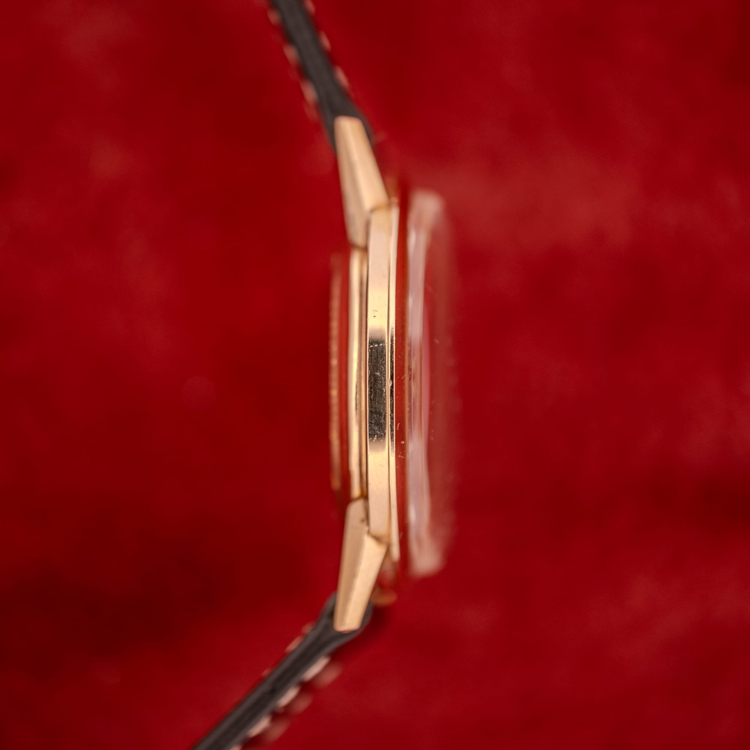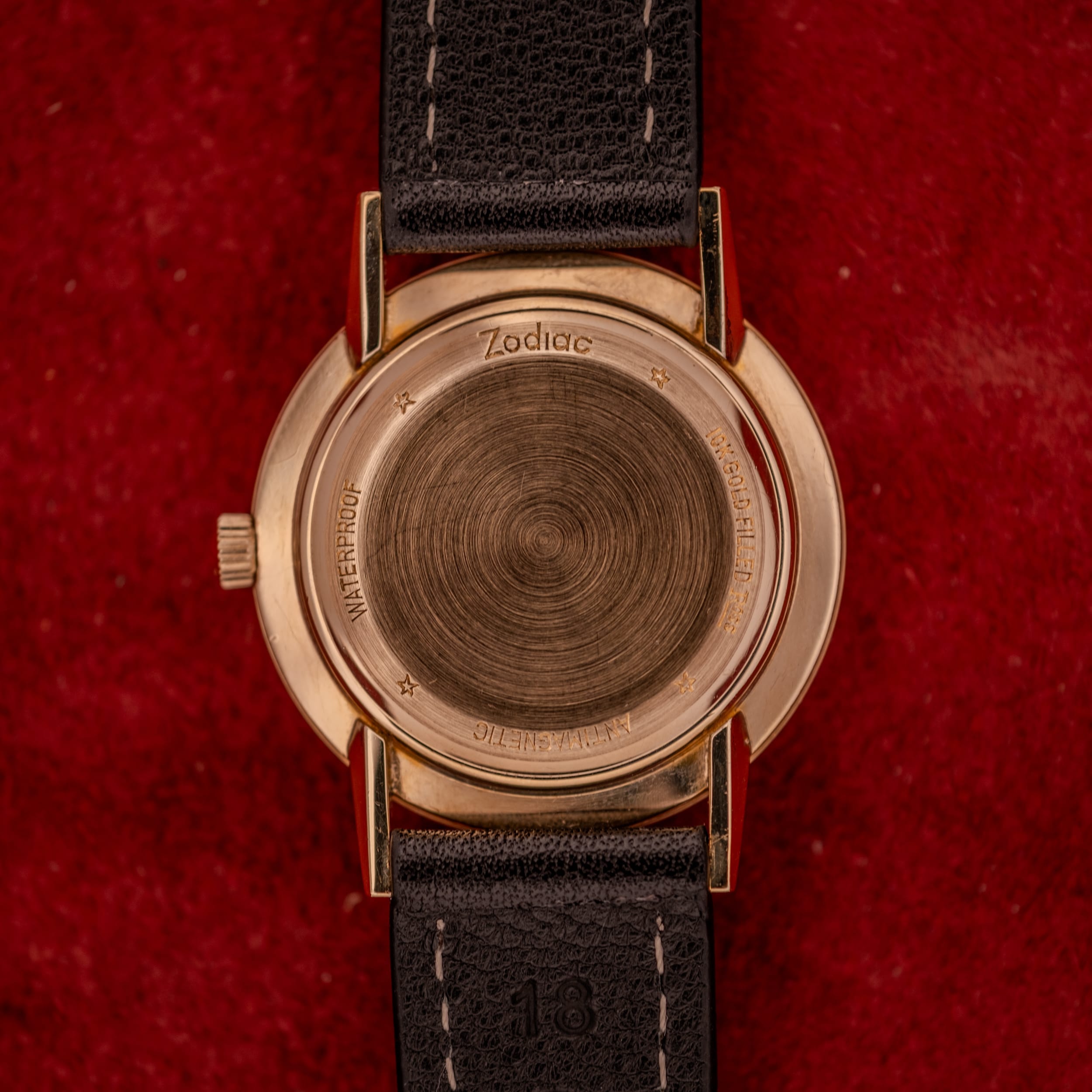 The 10K gold-filled case is in fantastic shape. The slim profile is immediately striking, revealing the kind of elegant proportions that define the best 1960s dress watches. The wire lugs extend gracefully from the case, giving the watch an airy, refined presence on the wrist. The signed Zodiac crosshair crown is original and crisp, and the caseback, stamped with “Zodiac,” “WATERPROOF,” “18K GOLD FILLED,” and “ANTIMAGNETIC,” retains its concentric circular brushing beautifully. The case sides show only the faintest hairline scratches from occasional wear, suggesting this watch spent much of its life in a drawer or worn only for special occasions.